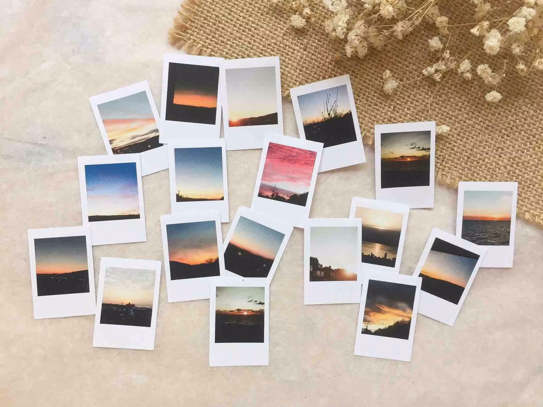 A nice set of 18 small stickers that look like polaroid photos. The stickers are about 3.5 x 2.5 cm with sunrise and sunset images. Perfect for decorating your notebook, scrap book or letters.