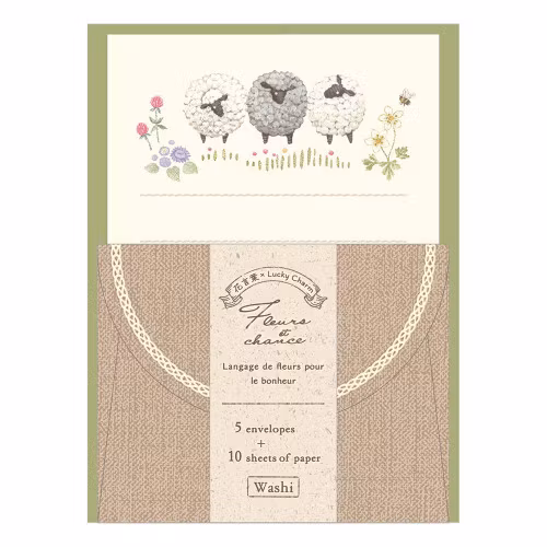 Sött linjerat brevpapper-set i miniformat. Krämfärgat washipapper med söta får längst upp. Bruna kuvert.