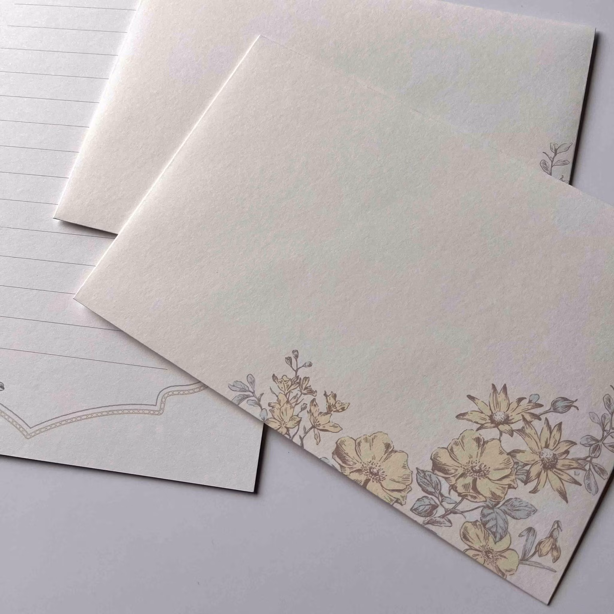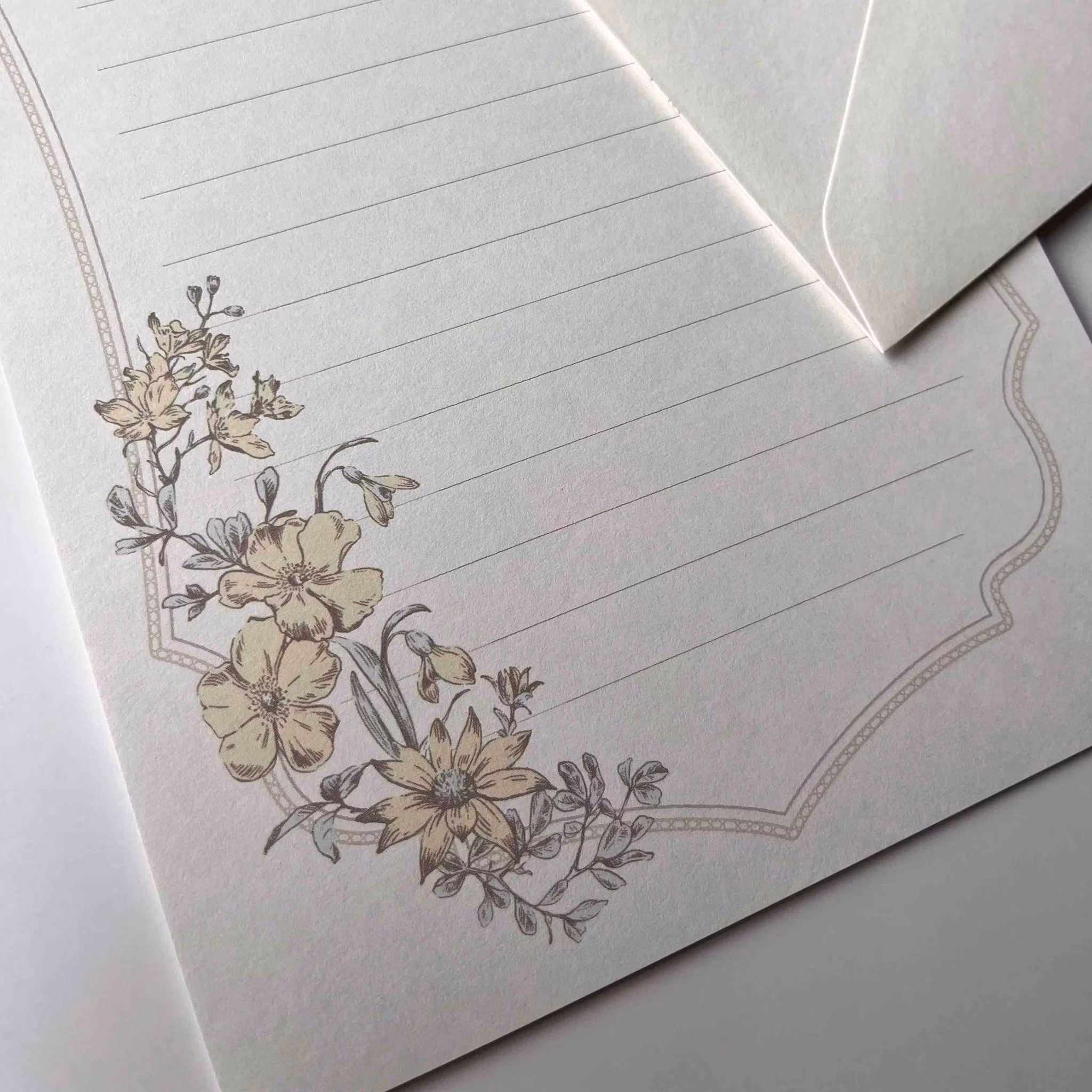 Vitt linjerat brevpapper med bård med blommor. Baksidan av pappret är mönstrat. Kuvert med tryck på framsidan och mönstrad flik.