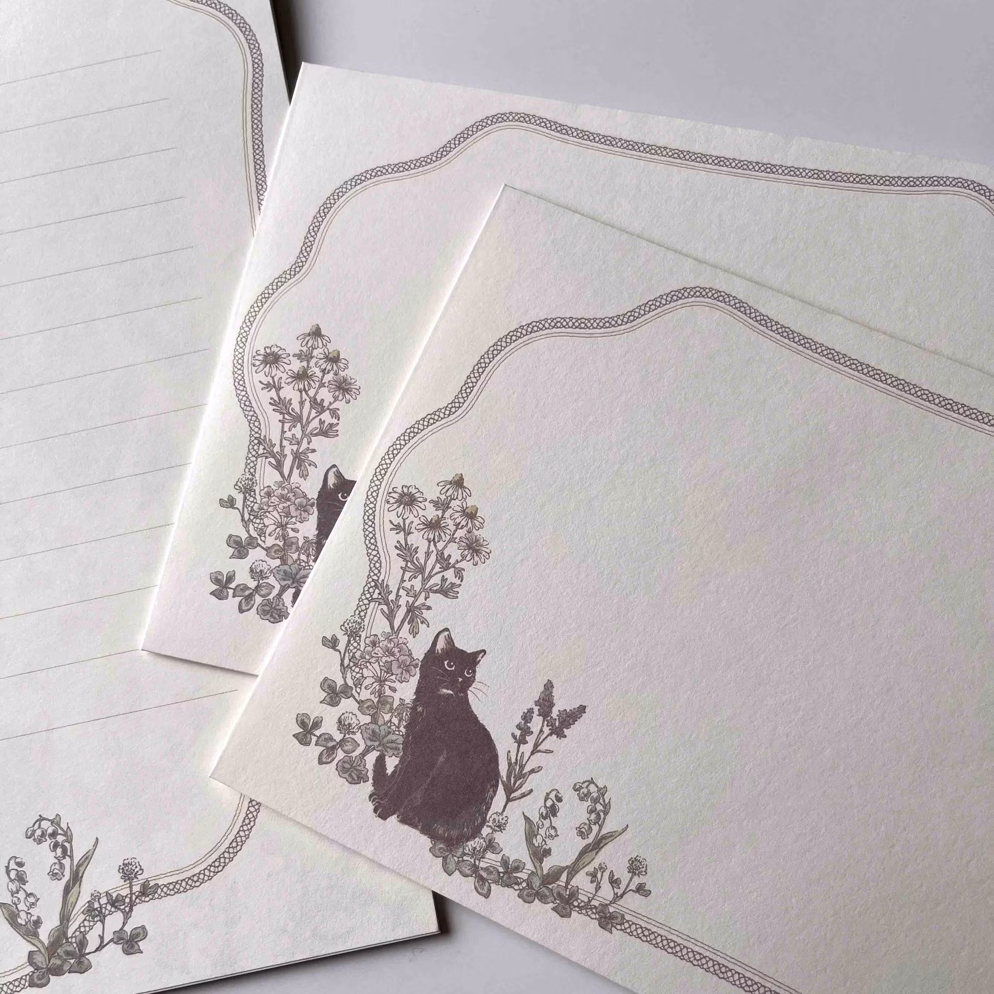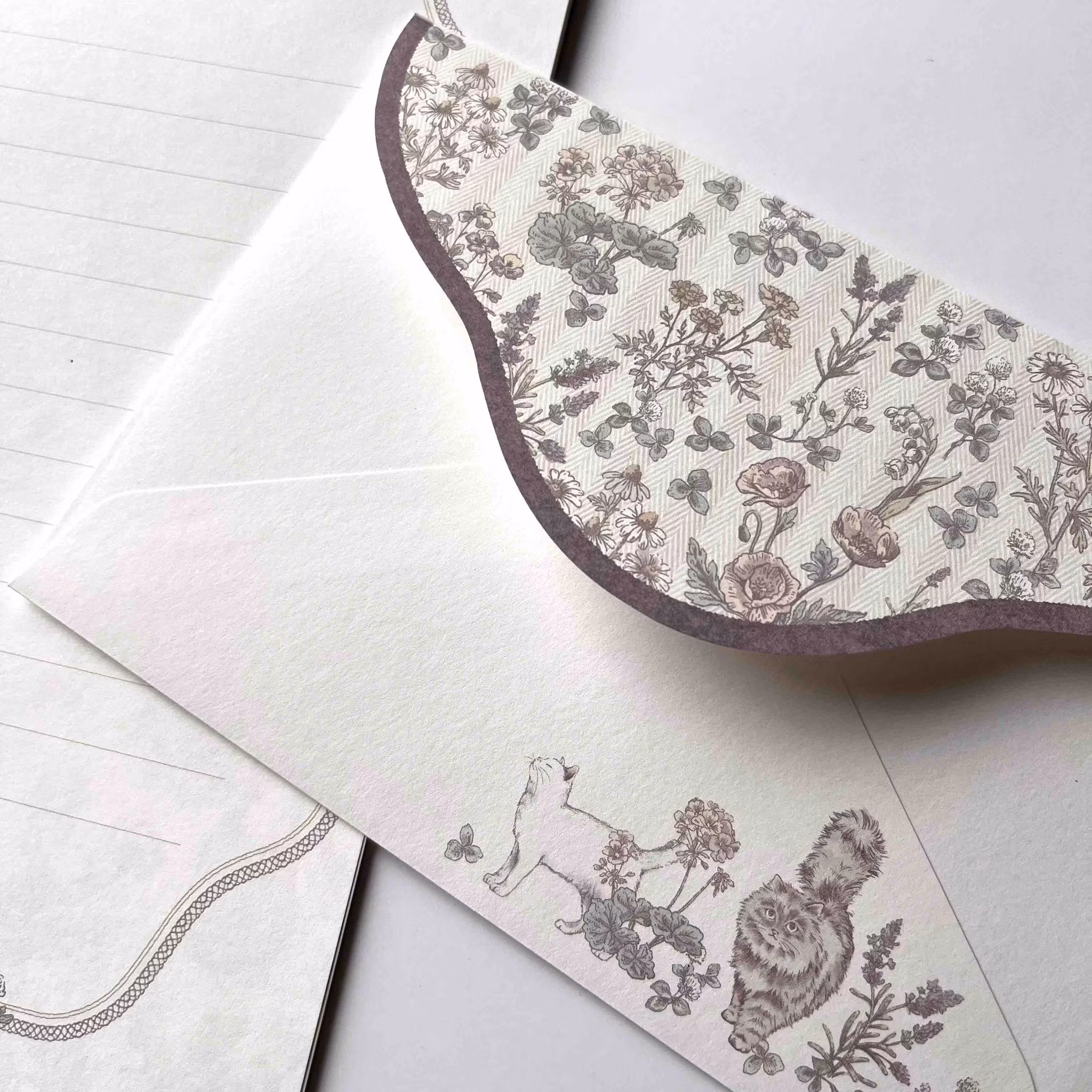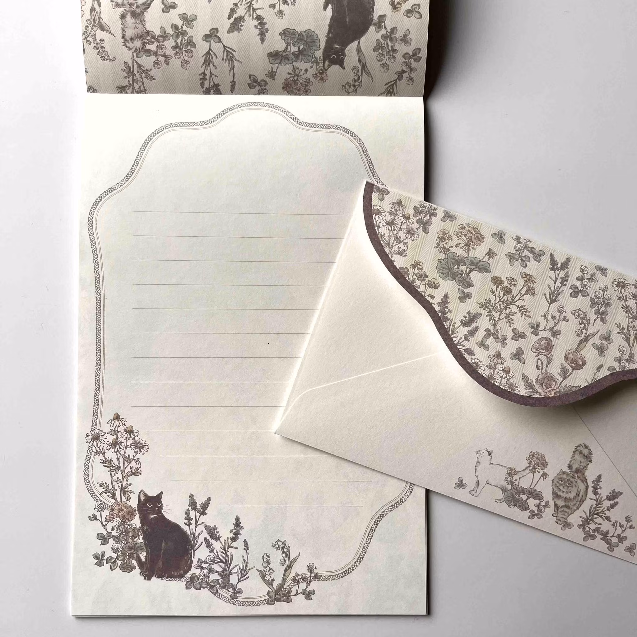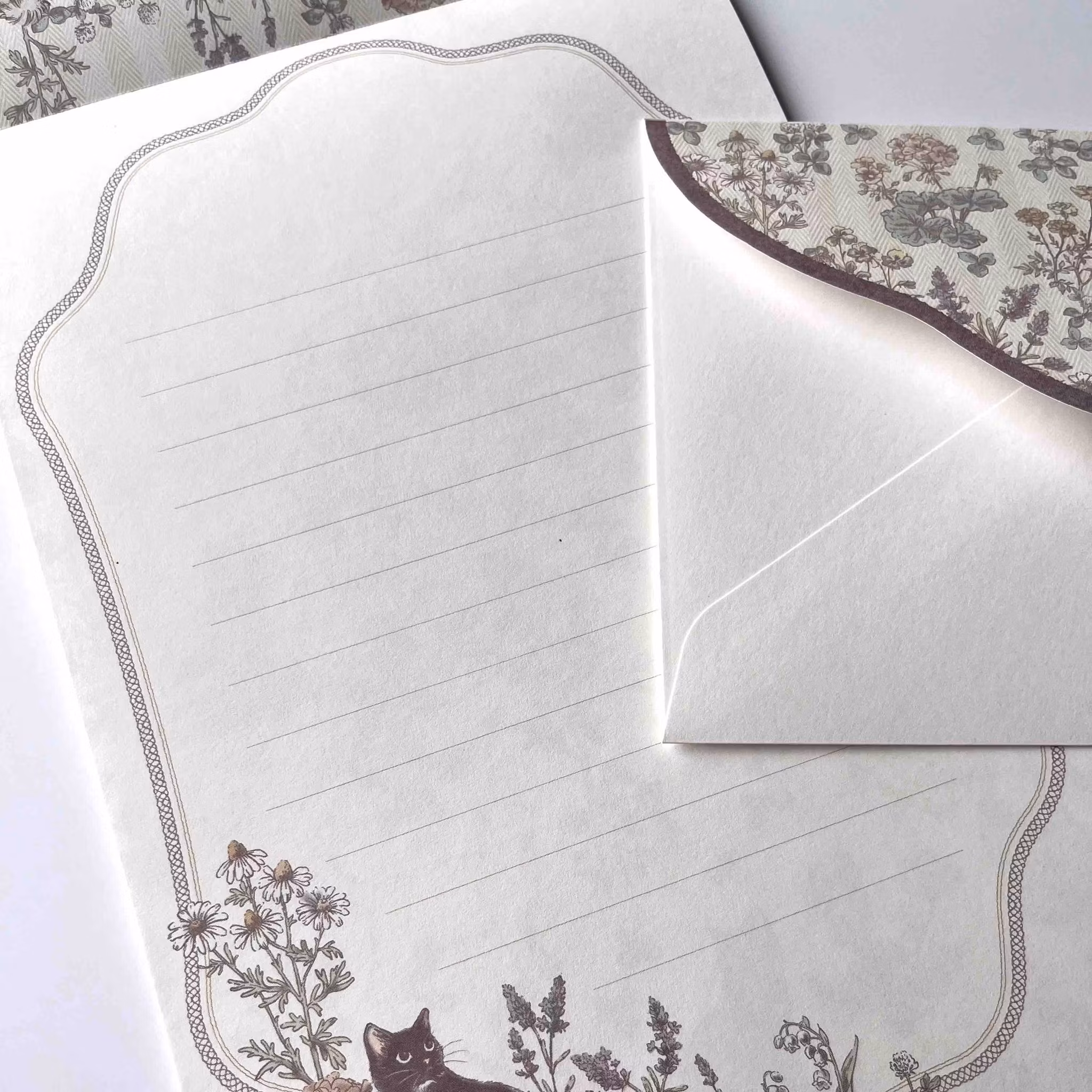 Vitt linjerat brevpapper med bård av blommor och en katt. Baksidan av pappret är mönstrat. Kuvert med tryck på framsidan och mönstrad flik.