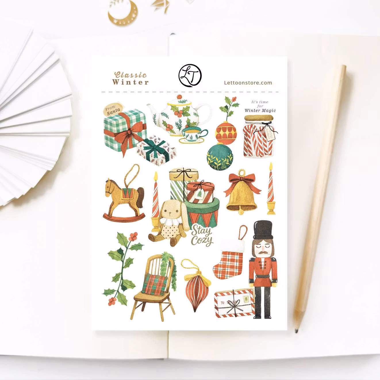 Ett klistermärkesark från Lettoon med mysiga motiv i juletid med bland annat julklappar, nötknäppare, tända ljus, järnek och polkagrisar. Tryckt på papper med vacker textur.