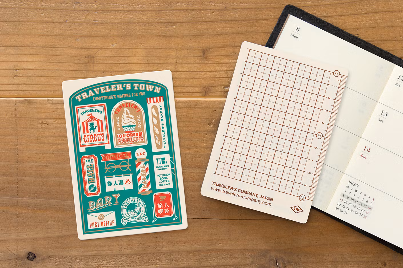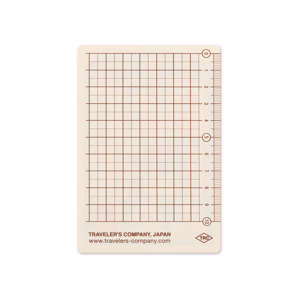 Traveler's Notebook Underlay är en praktisk skiva du lägger under pappret när du skriver och som ger ett bra stöd när du vill skriva medan du är på språng. Men också perfekt att använda som guide när du skriver på onlinjerade papper då baksidan har ett 5x5 mm rutnät och linjal. Framsidan har en roligt mönster med ett 2024 års tema "Traveler's Town".